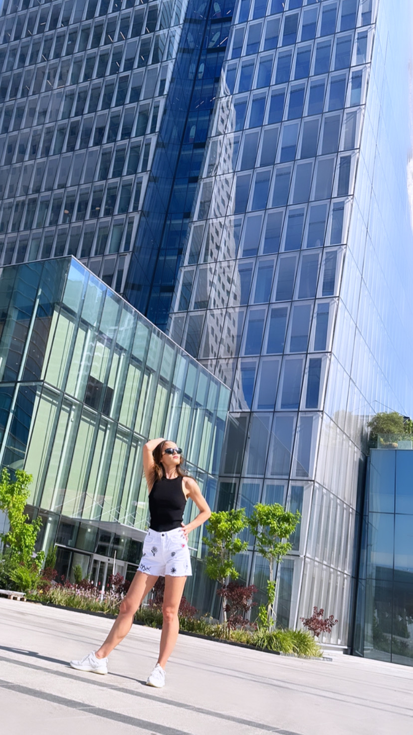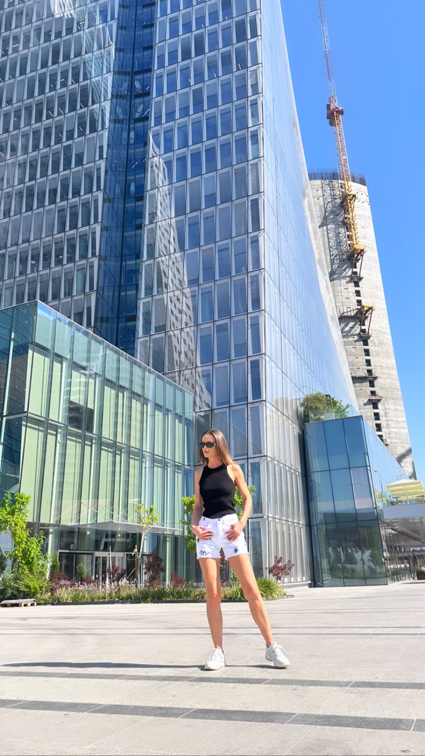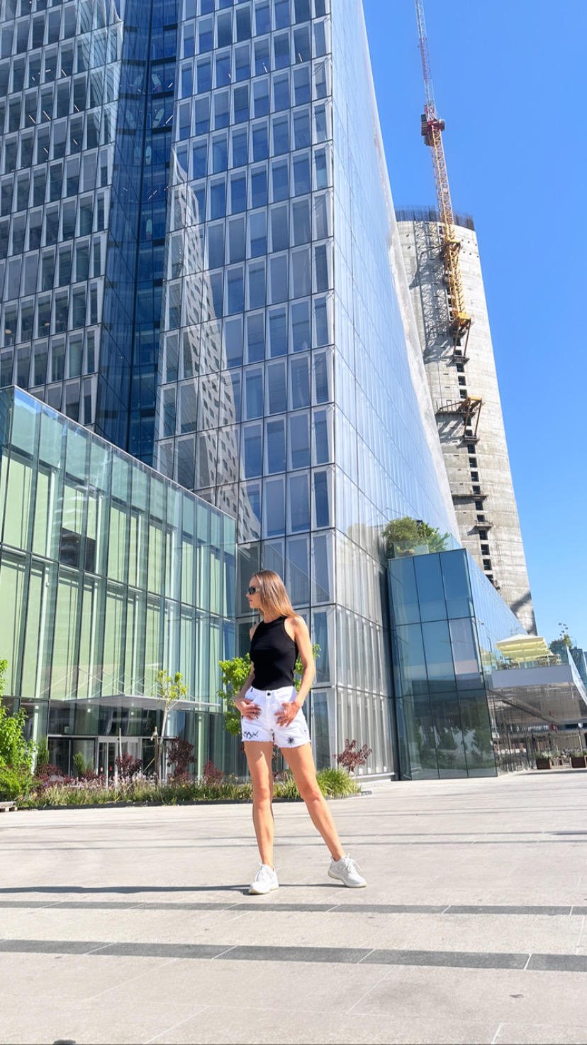 Alege să strălucești în această vară cu un outfit elegant și proaspăt. Pantalonii scurți albi cu un subtil model adaugă o notă de rafinament casual, capturând lumina soarelui într-un mod subtil. Modelul negru pe fond alb aduce un contrast subtil și îți permite să te evidențiezi într-un mod subtil și sofisticat.